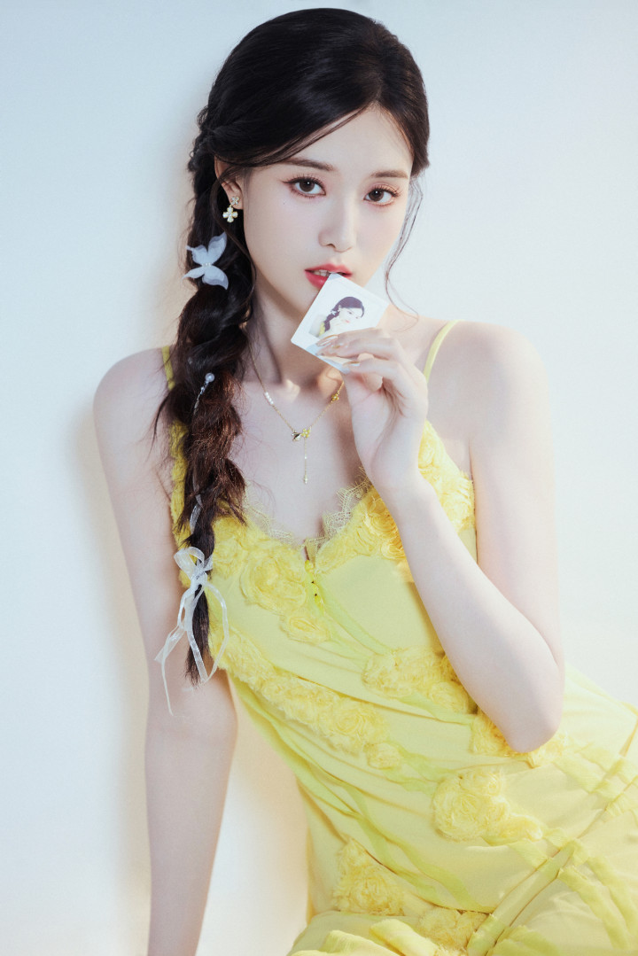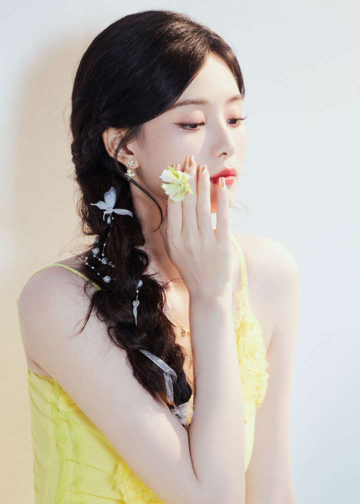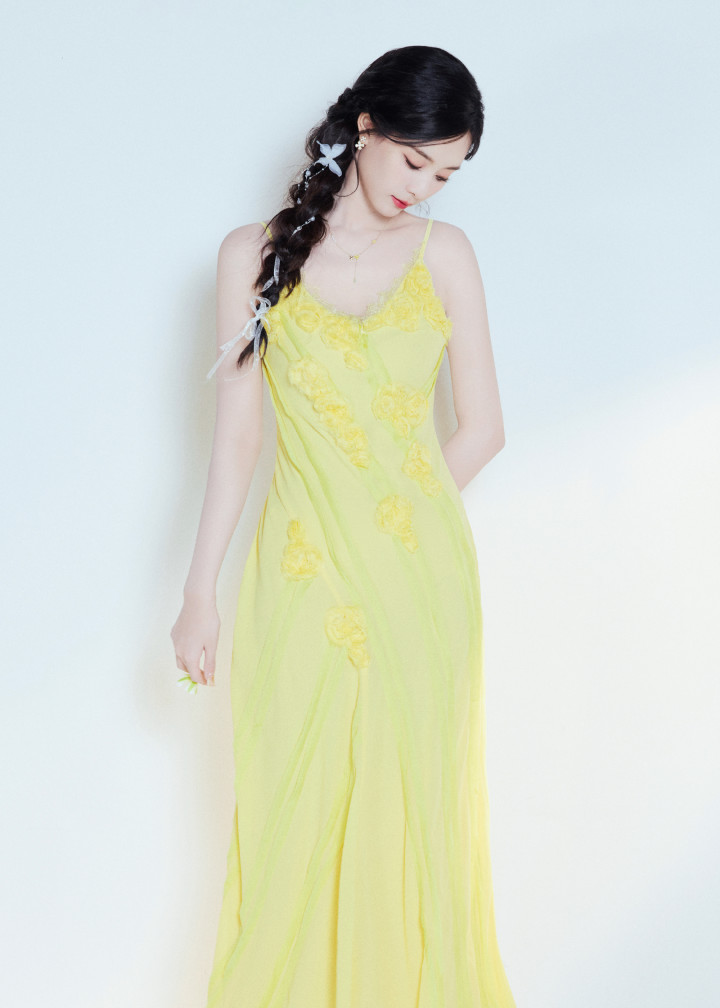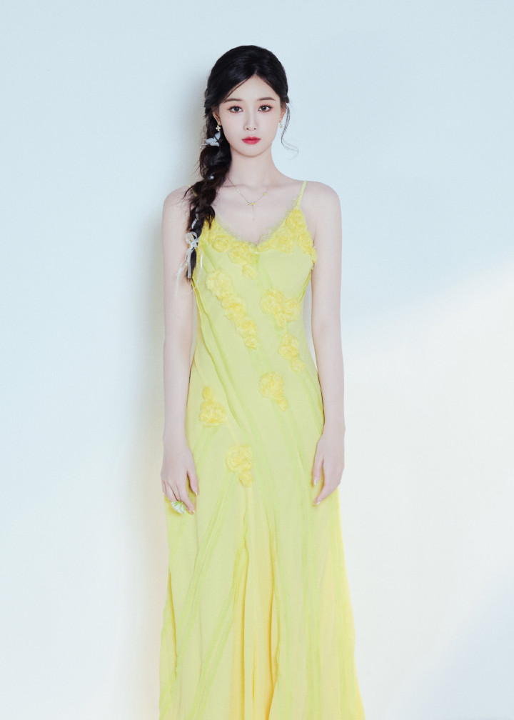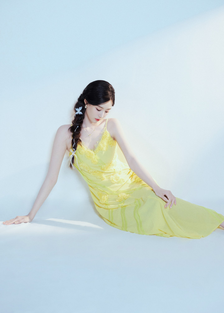 徐艺洋一袭浅黄长裙, 勾勒温柔曲线, 麻花辫添几分灵动俏皮!